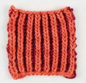Особливістю такої резинки є те, що при в’язанні її на звичайних прямих спицях потрібно пров’язувати кожний рядок двічі. Та при в’язанні по колу, техніка трохи упрощується, потрібно лише змінювати кольорові нитки при початку нового рядка.