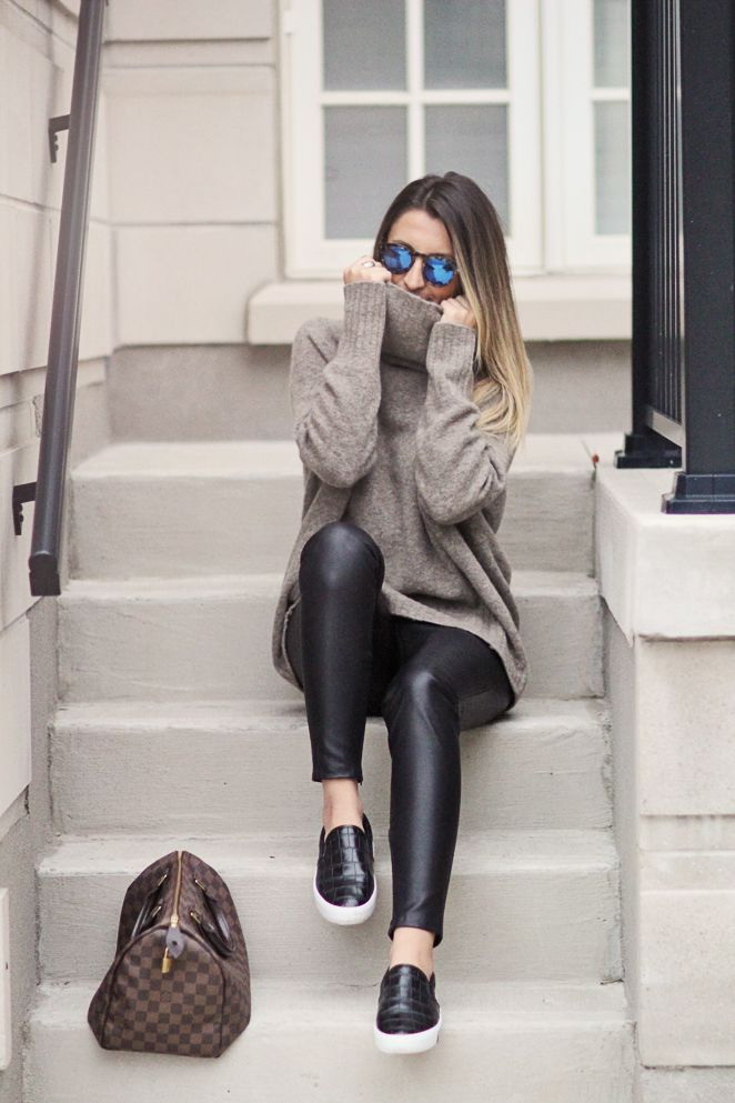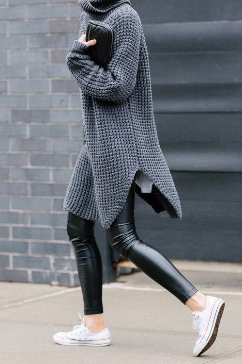 Сірий светрик-водолазка надзвичайно підходить до шкіряних легінсів і білих кедів: