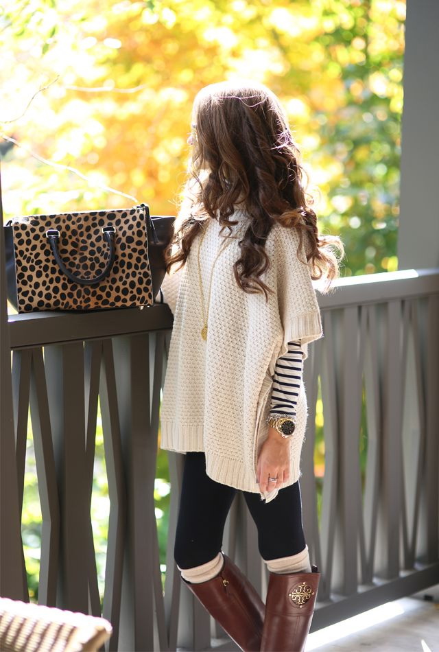 - 8 Наступний светрик-пончо світло-кремово/odyagayemos-v-obyemni-svetriki/о кольору одягається як сукня з чорними легінсами і коричневими чобітками: