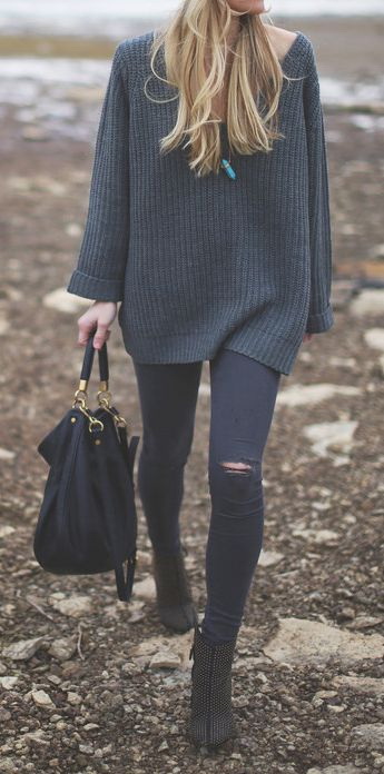 До широкого сірого светрика найкраще підходять чорні скіні і ботфорти: