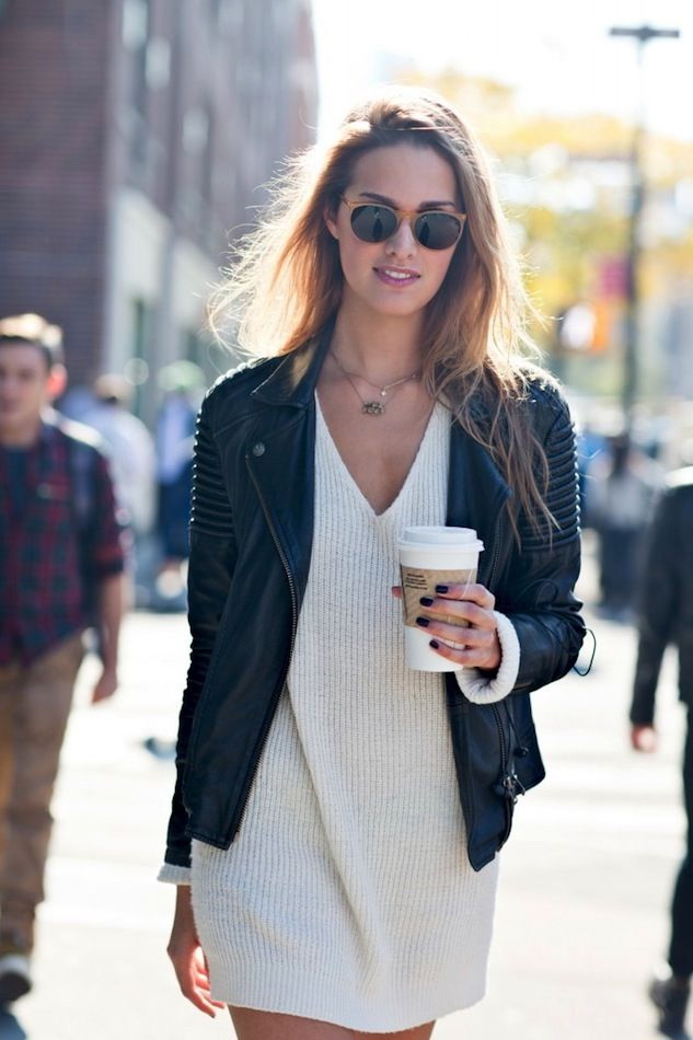 Деякі довгі светрики можна носити як сукню, чудовим доповненням якого стане шкіряна куртка:
