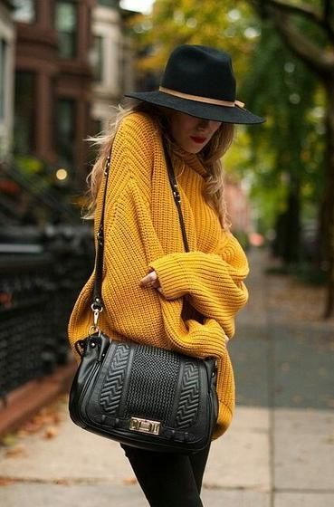 - 5 До светрика гірчичного кольору пасує ши/odyagayemos-v-obyemni-svetriki/рокополий капелюх і джинси скіні: