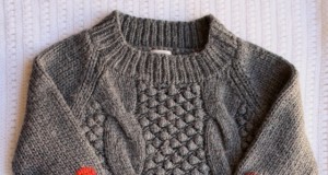 З лицьового боку, користуючись короткими спицями і починаючи з центру пройми, притримуємо з’єднання двох частинок і витягуємо по 1 петлі з кожної петлі вздовж пройми, починаємо в’язати по колу.