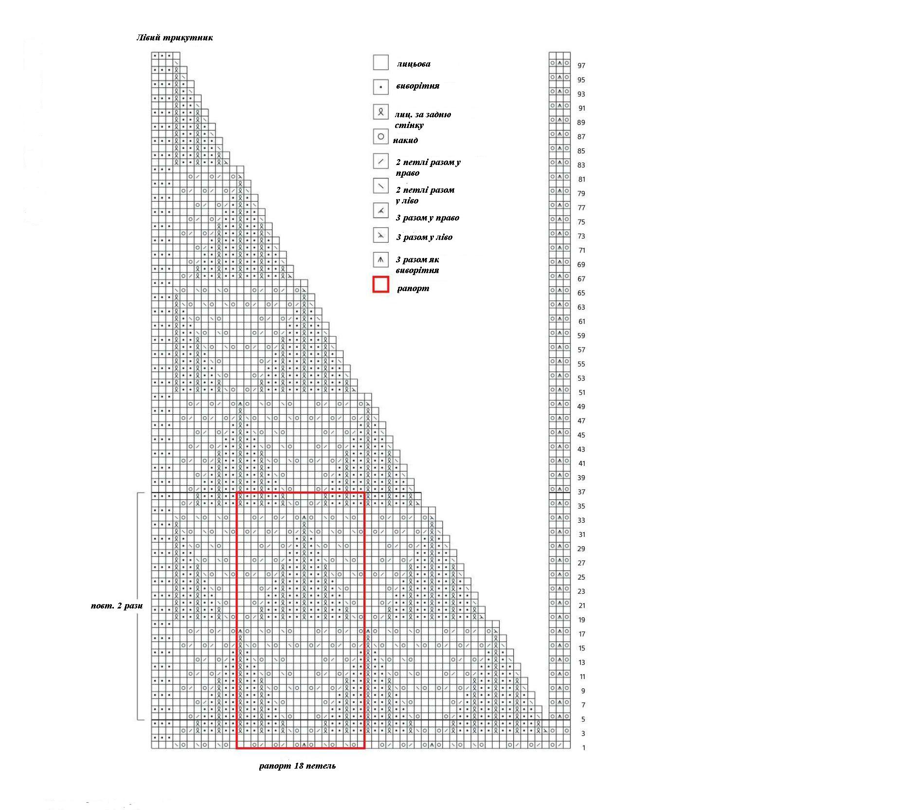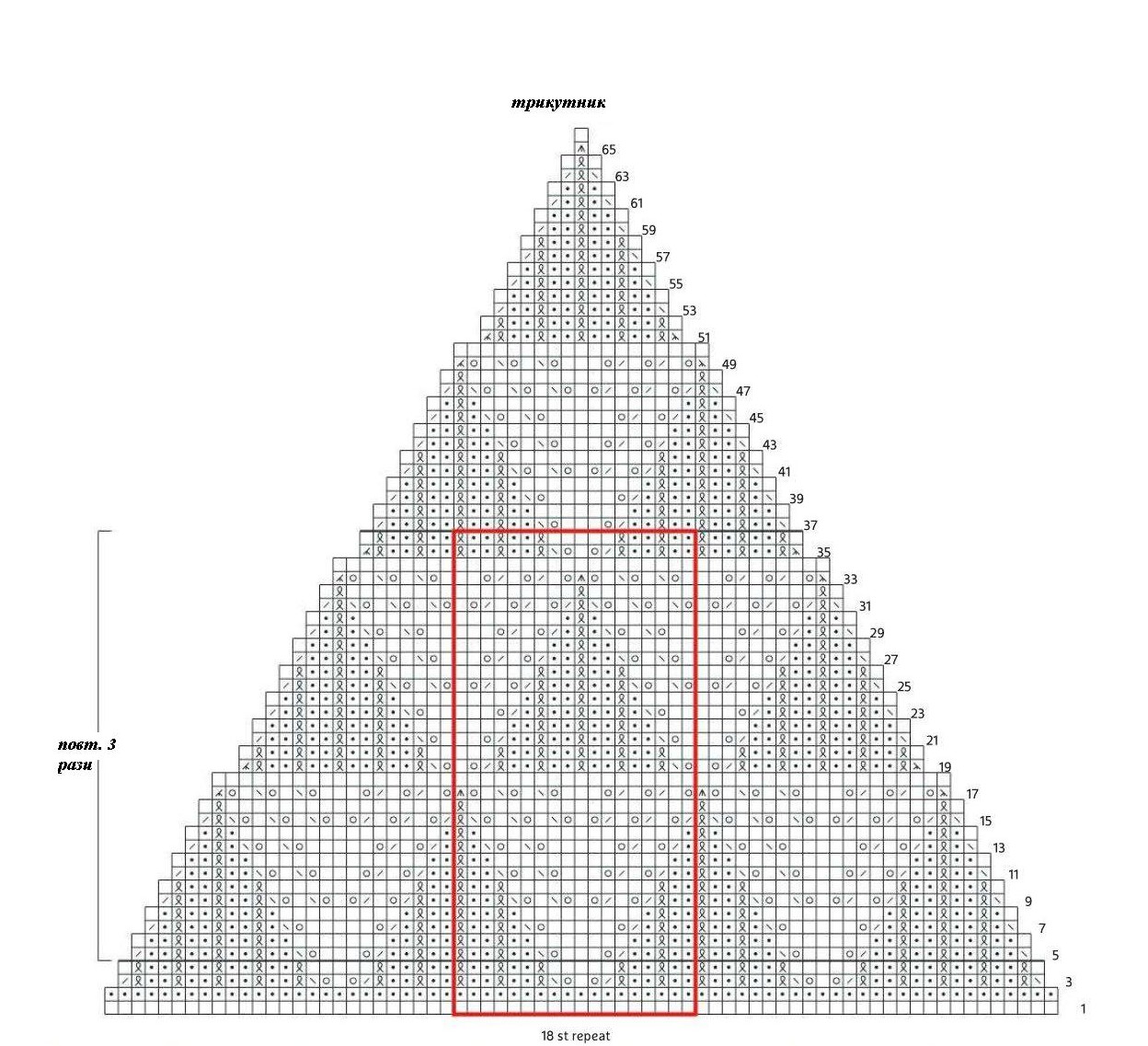 - Набір петель починається з нижнього краю шалі, вив’язується трикутник з деяких набраних петель по лівому краю шалі; чим більшим вив’язється трикутник тим більше використовується набраних петель і вив’язується коротких рядів.