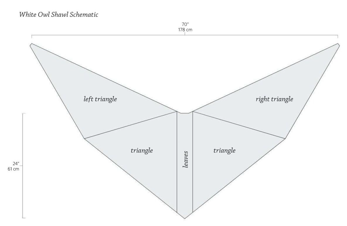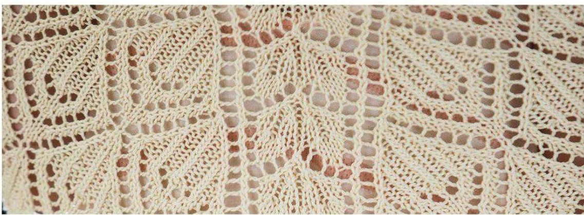 - Центральна частина шалі вив’язується з усіх петель посередині. Ця секція сполучає між собою лівий і правий трикутник, утворюючись іж ними з візерунка “листя”, і має ще два трикутники між центральною колонкою і двома трикутниками.