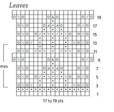 Центральна частина: Наступний ряд (Лиц. ст): В’яжемо 1 рядок з “правий трикутник” – 77 петель, ставимо маркер, 1 рядок з “трикутник” – 143 петлі, ставимо маркер, 1 рядок з “листя” – 17 петель, ставимо маркер, 1 рядок з “трикутник” – 143 петлі, ставимо маркер, 1 рядок з “лівий трикутник” – 77 петель.