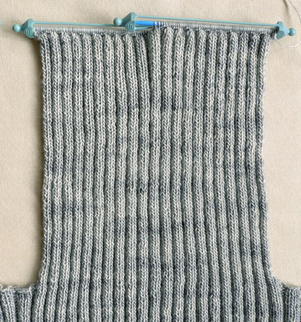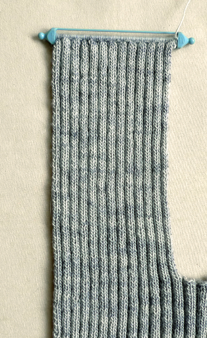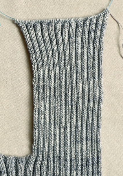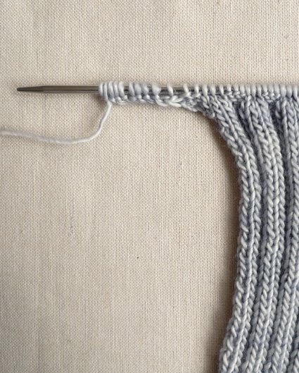 Тепер ми будемо в’язати лише цю частинку, решта петель лишаємо або на спиці, або переносимо на тримай для більшої зручності.