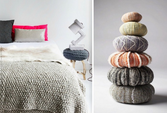- Пуфи обв’язані об’ємною пряжею стануть незамінними у вітальні з креативними світильниками, чудово для посиденьок з друзями.