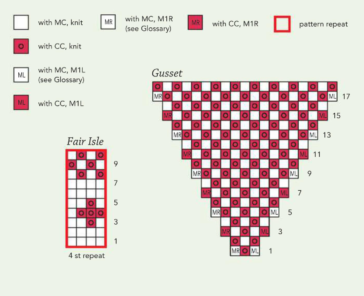 Тепер розділяємо по 22 петлі на дві спиці. Та між дво спицями витягуємо 3 петлі з полотна (в залежності на яку руку буде рукавиця). З цих петель утворимо великий палець, поступово добавяючи петлі. Схема в`язання подана вижче (Gusset – Вставка). А руку продовжуємо в`язати за Fair Isle.