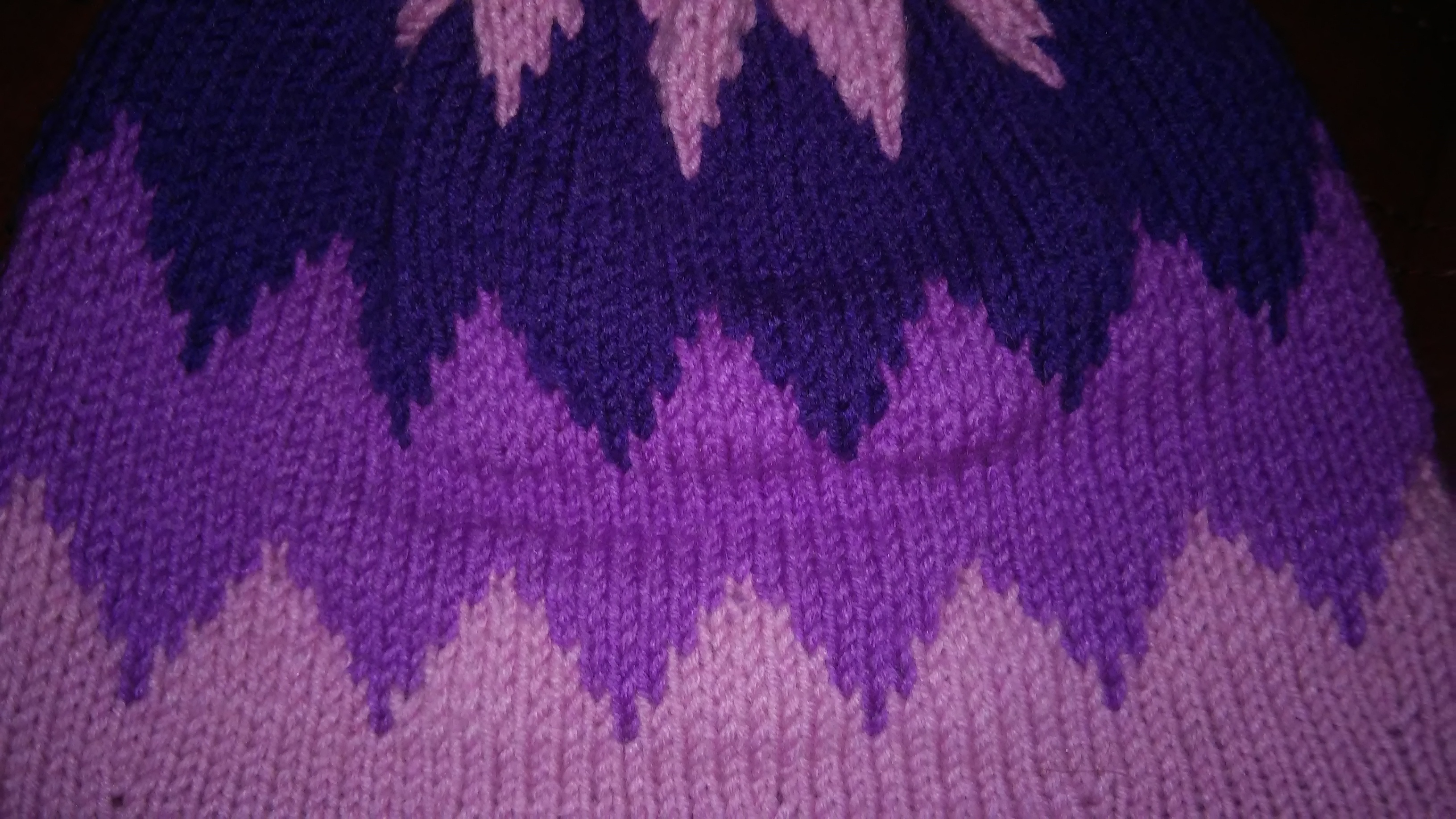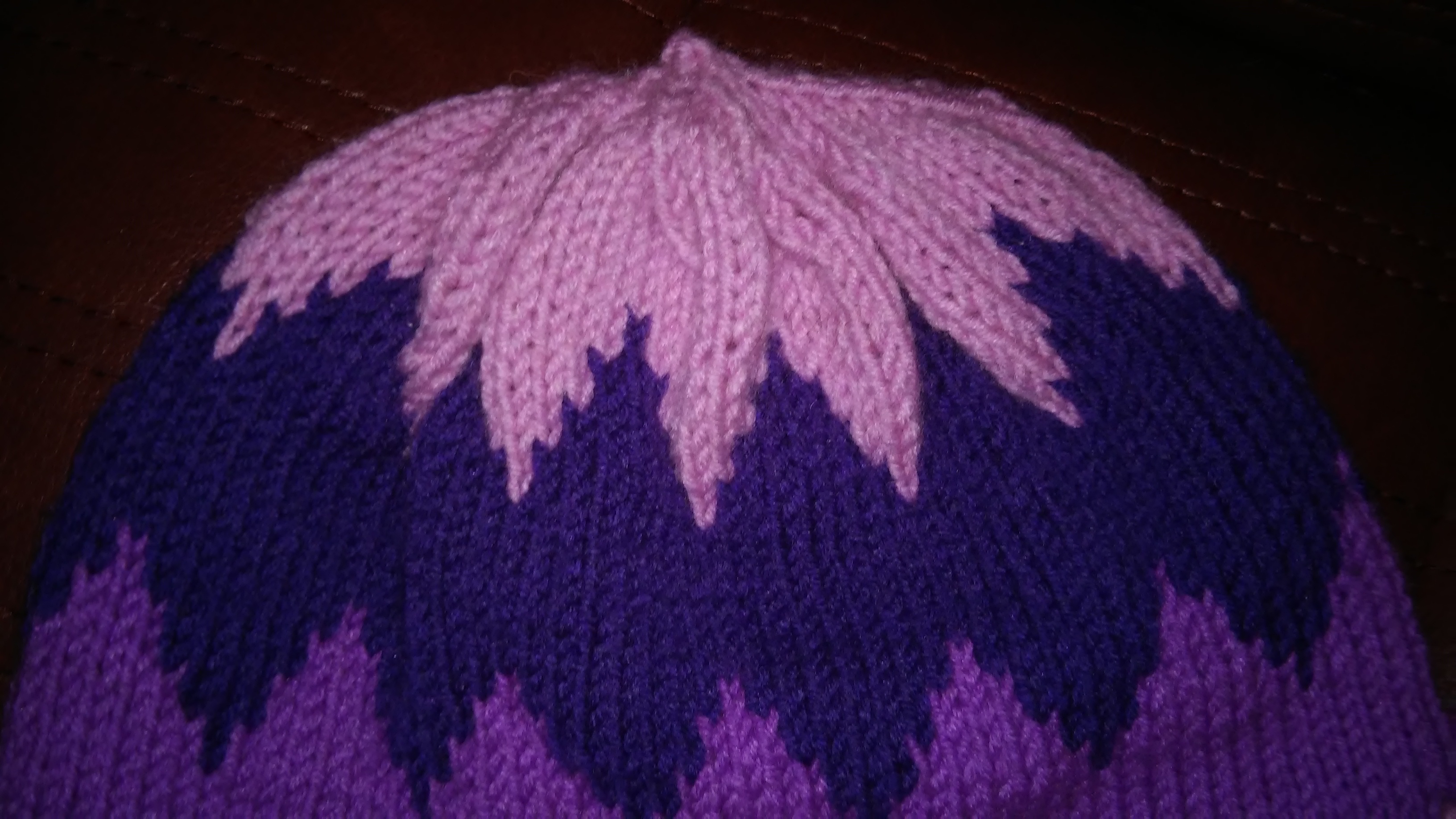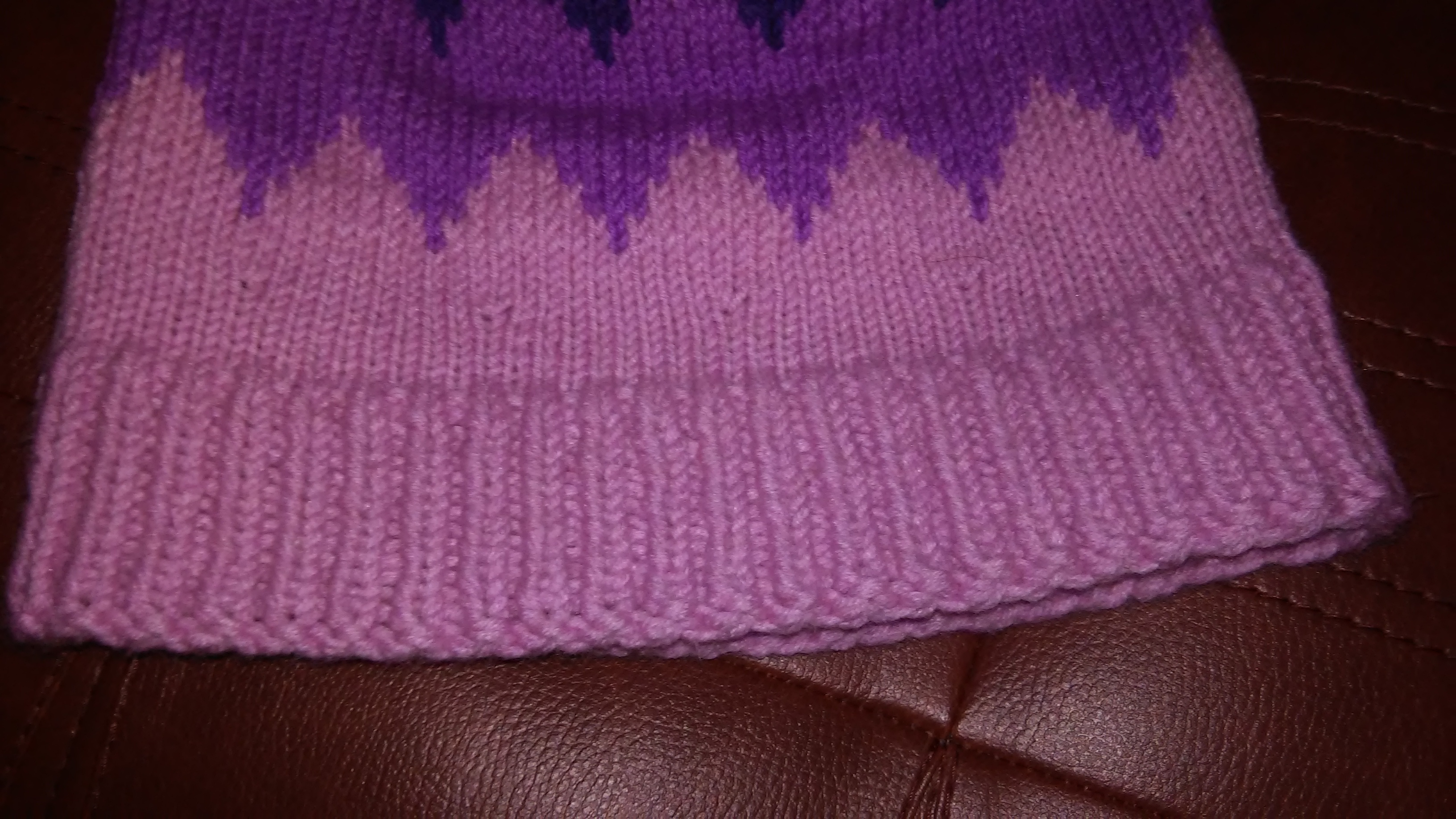 Крок 6: Темно фіолетовою пряжею пров’язуємо ще 8 рядків і знову переходимо на рожеву.