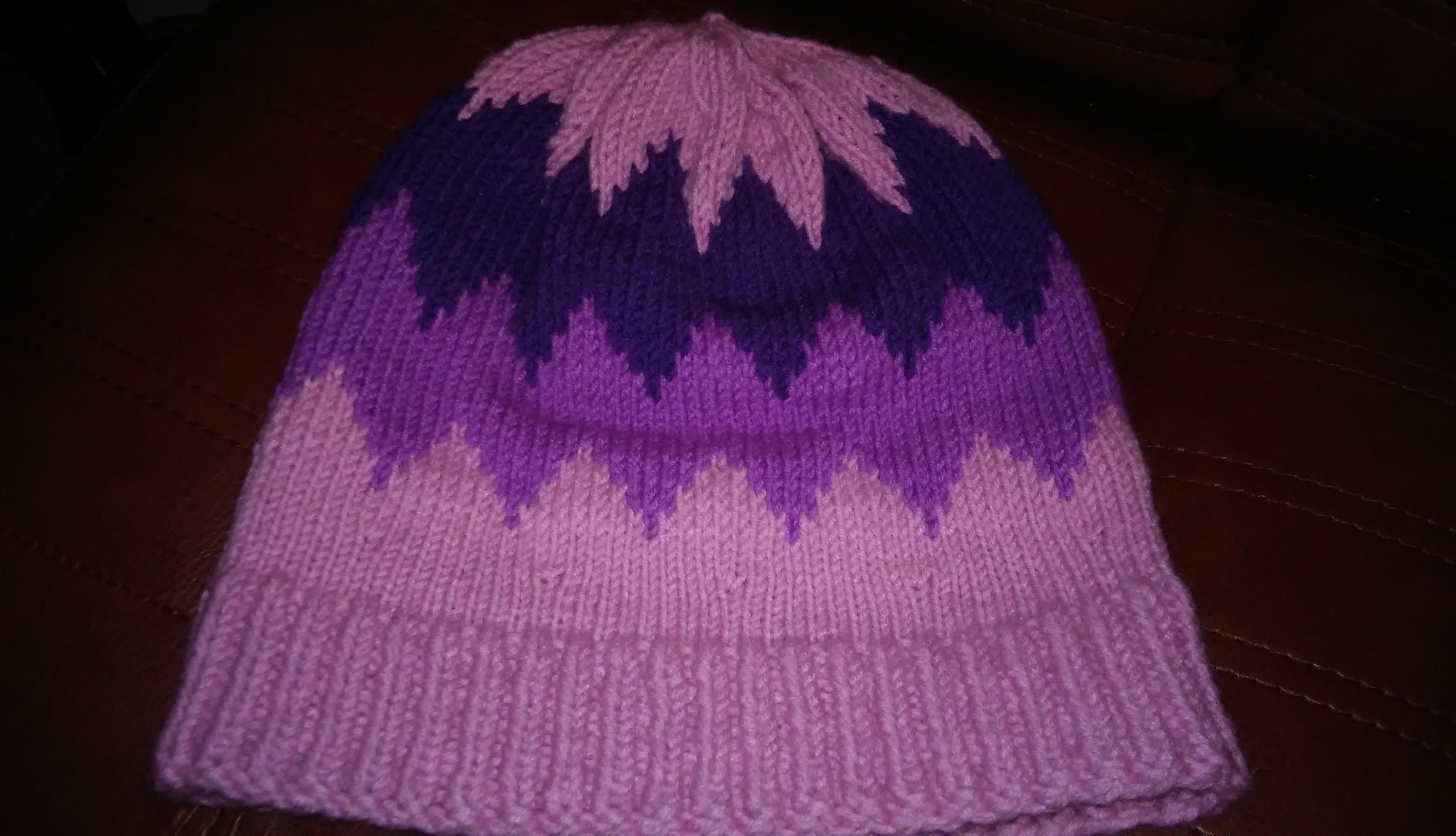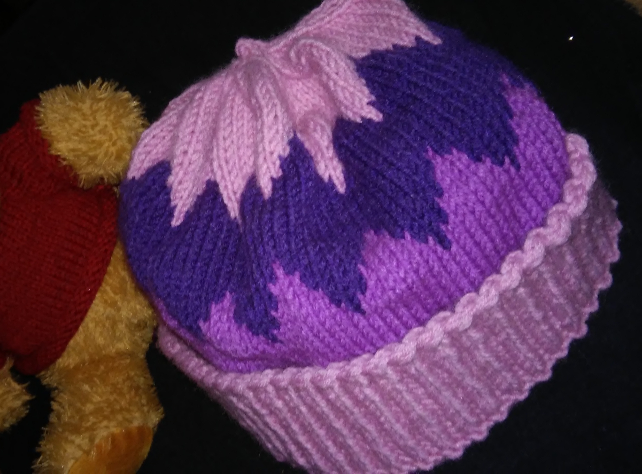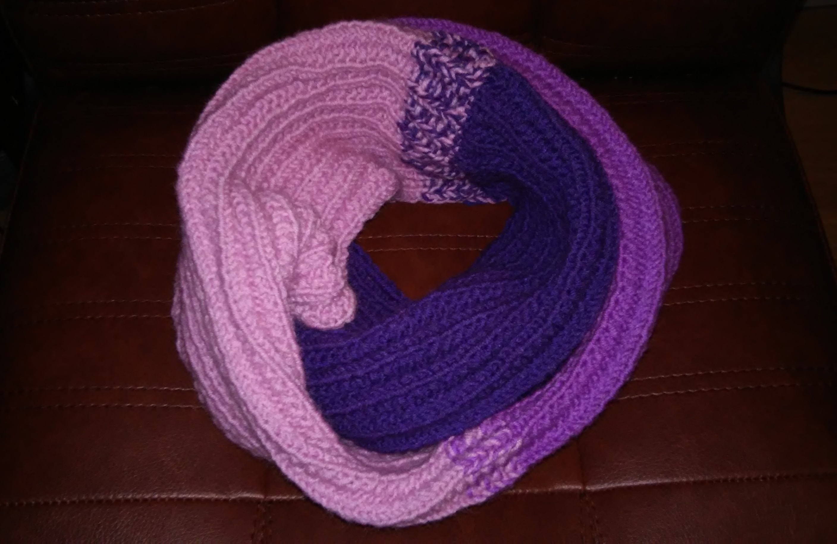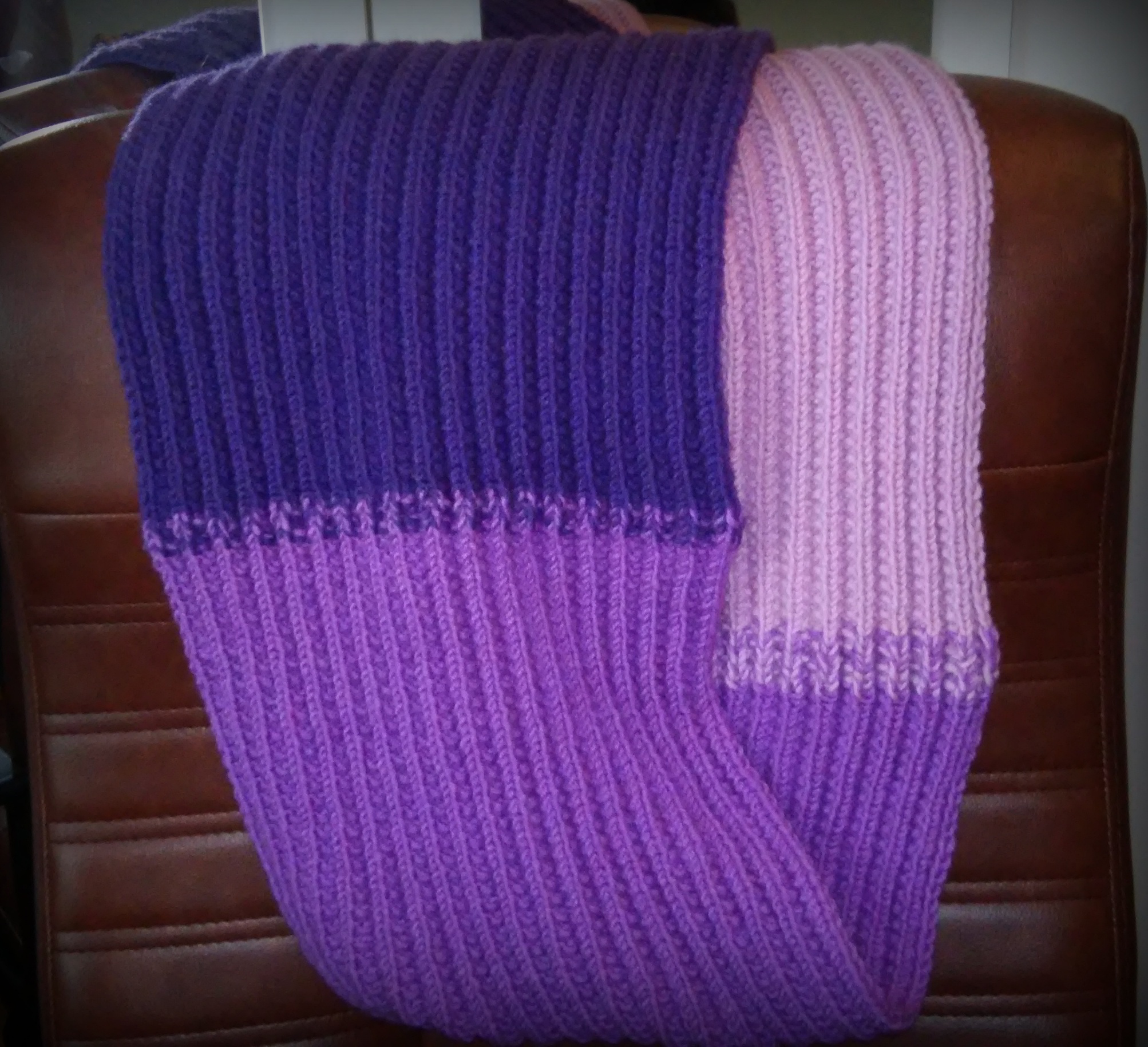 Крок 6: Темно фіолетовою пряжею пров’язуємо ще 8 рядків і знову переходимо на рожеву.