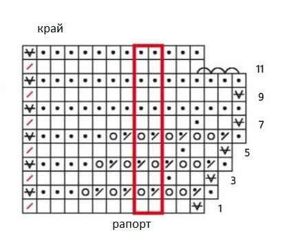 Нижній край: З виворотньої сторони використовуючи традиційний метод набору петель набераємо 21 (21, 23, /vyazaniy-kardigan-spicyami/23, 25, 25, 27) петель на праву спицю. Наступний ряд (ЛС): 1 петлю знімаємо пров’язуючи наступну виворітньою і продіваючи її й попередню, лицьовими до кінця. В’яжемо за схемою візерунку Край з 1 по 12 ряд 21 (22, 23, 26, 28, 30, 32) рази, згодом ще раз з 1 по 9 ряд. Закриваємо петлі.