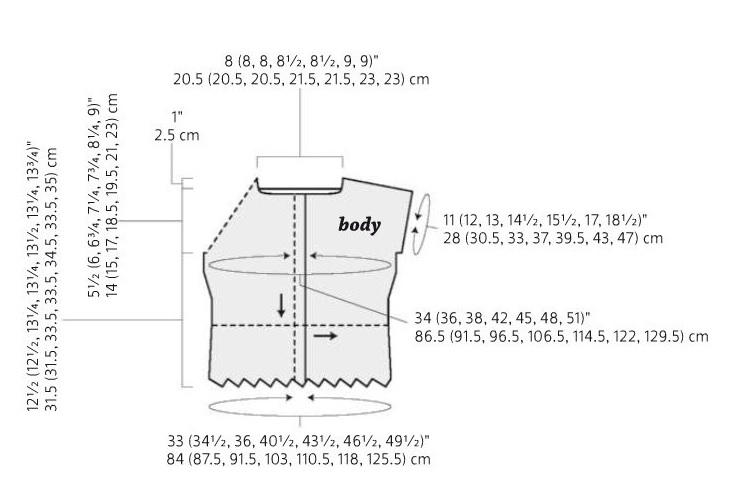 Талія: Зменьшувальний ряд (ЛС): *в’яжемо лицьовими до останніх 6 петель перед маркером, 2 разом, 4 лиц., пропускаємо маркер, 4 лиц., 2 разом* повторюємо від * ще один раз до кінця – 4 петлі зменьшенно. Повторюємо зменьшення у кожному 10 (10, 12, 12, 12, 12, 12) рядку, двічі – 128 (136, 144, 160, 172, 184, 196) петель лишилось: 33 (35, 37, 41, 44, 47, 50) петель для кожної половинки, 62 (66, 70, 78, 84, 90, 96) для спинки. В’яжемо 18 (18, 16, 16, 16, 14, 14) пар рядків, закінчуючи на лицьовій стороні. Наступний ряд (ВС): В’яжемо за зразком, зменьшуючи 4 (2, 0, 2, 2, 2, 2) петлі, щоб вийшло 132 (138, 144, 162, 174, 186, 198) петель. Обрізаємо нитку.