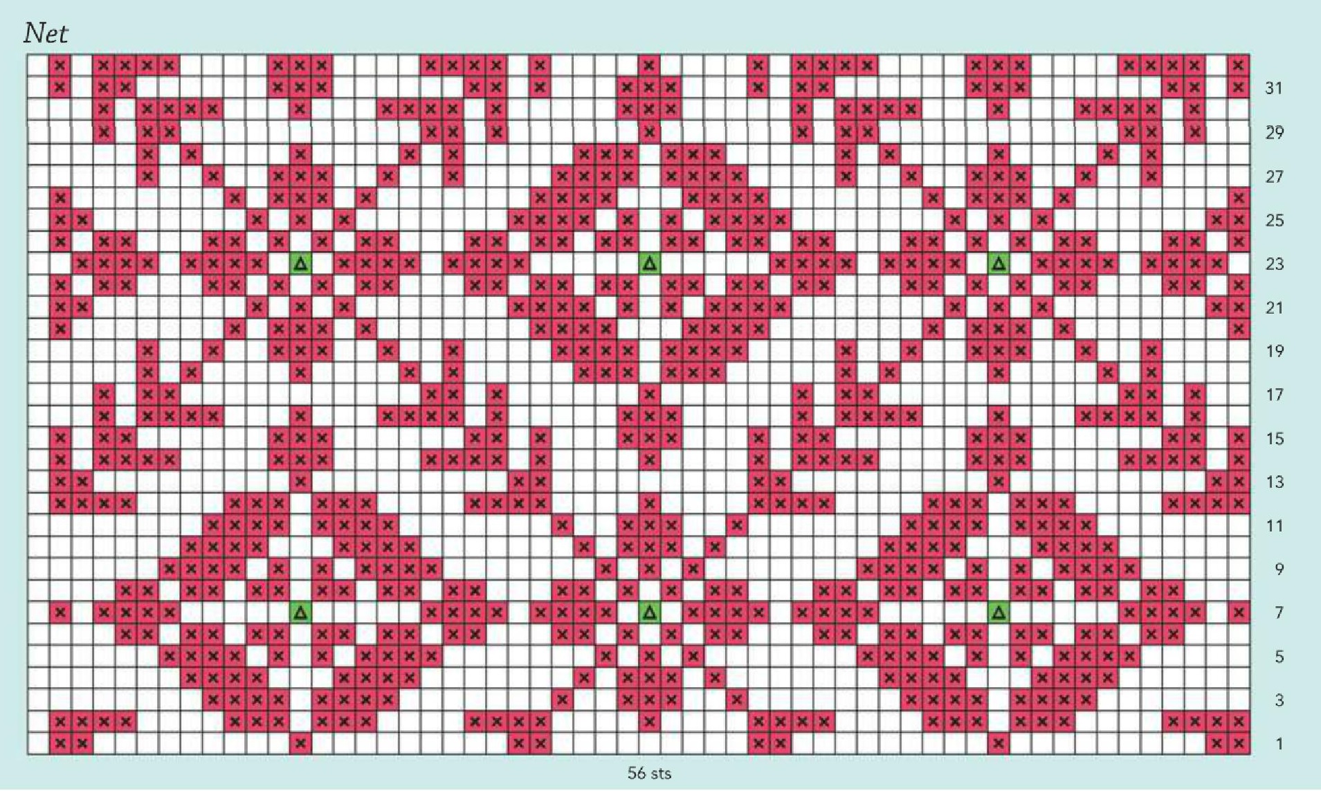 Закінчивши візерунок пров`язуємо рядок лицьовими петлями. Використовуючи дві спиці + додаткову, розділяємо заг. кількість петель на два, тобто по 56ть на кожну, обов`язково маємо врахувати, що одна спиця буде передній бік панчоха, а інша задній. На одній спиці буде один візерунок (Net). В`яжемо його 32 рядки, потім повторюємо лише перші 7м.