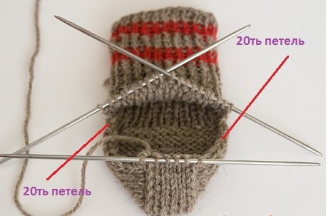 Для в`язання п`ятки ми беремо спицю на якій візерунок Stripe та по одній петлі з початку і кінця перекиндаємо на іншу спицю, яку закріплюємо. У нас лишається 54 петлі. Тут варто використовувати нитку одного кольору, для контрасту лише червоного. Пров`язуэмо петлі панчішною в`язкою. Згодом розділяємо їх на три частини 1/20, 2/14, 3/20.