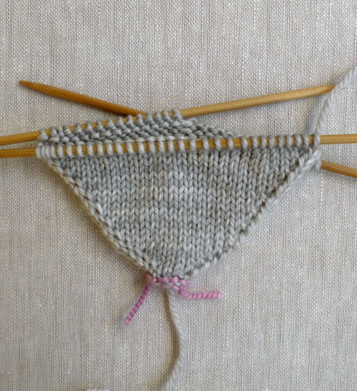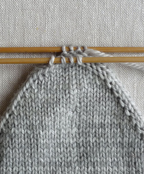 3 спиця: лицьовими до останньої петлі, накид, 1 лицьова; Має збільшитись на 4 петлі.