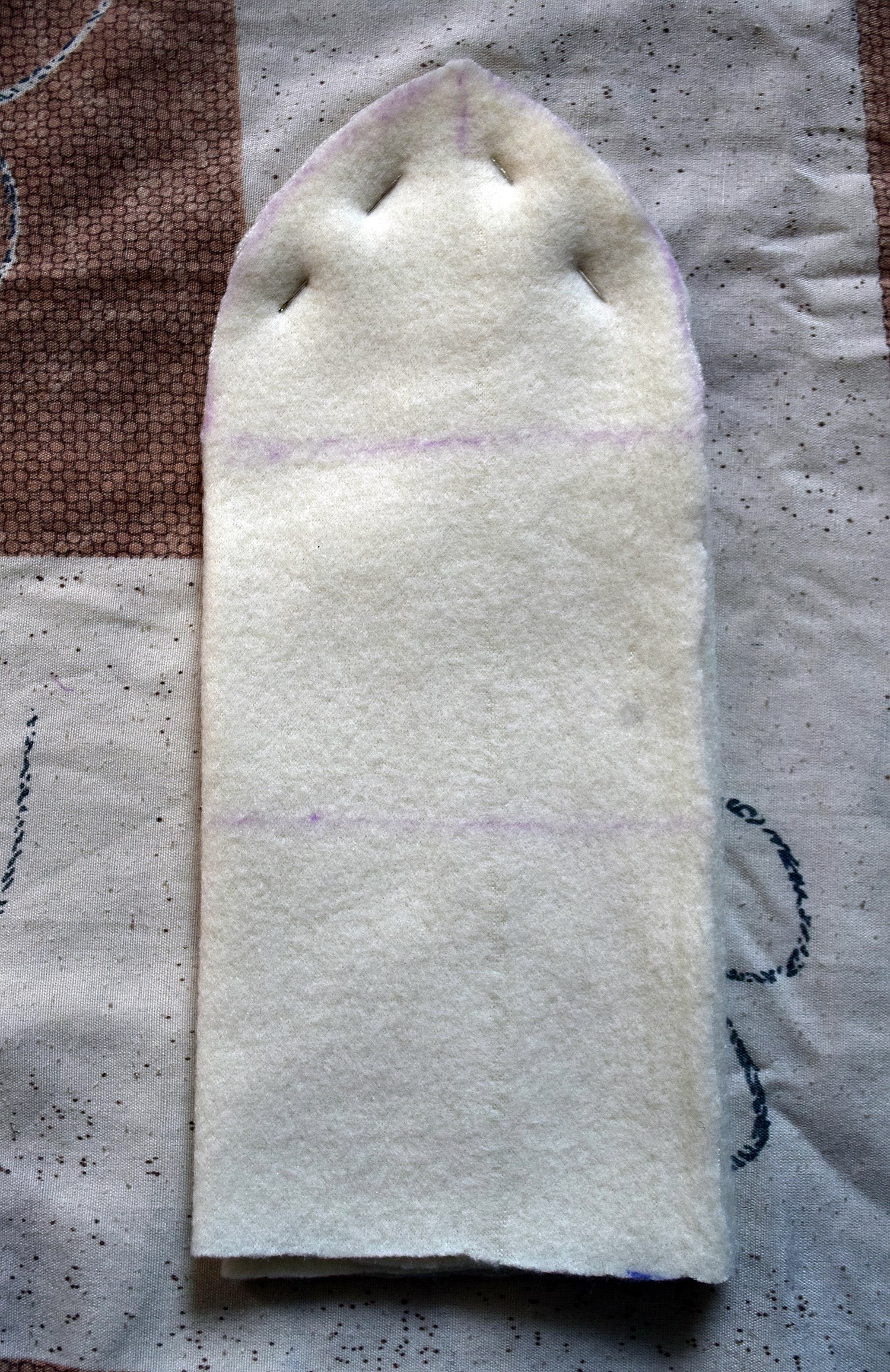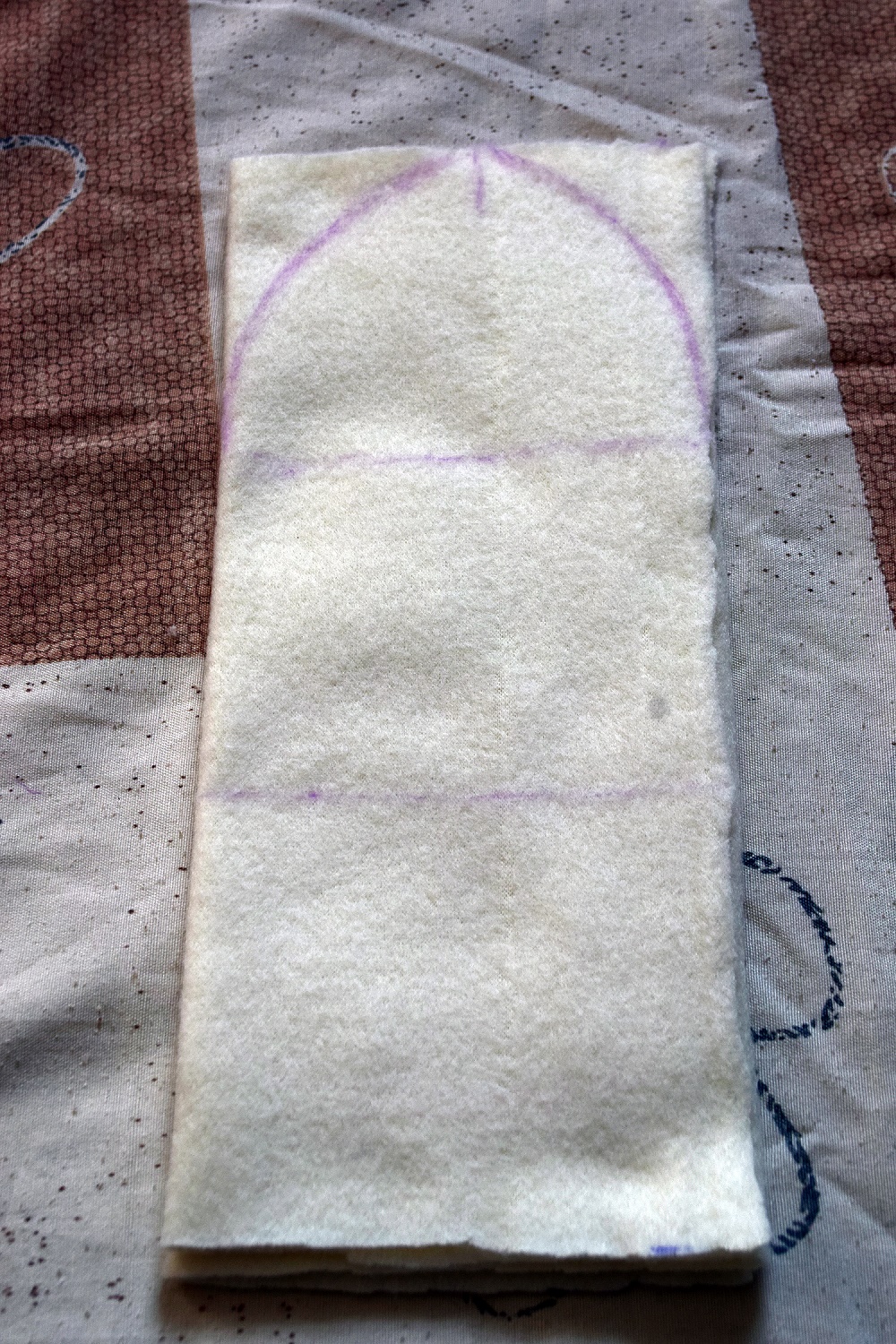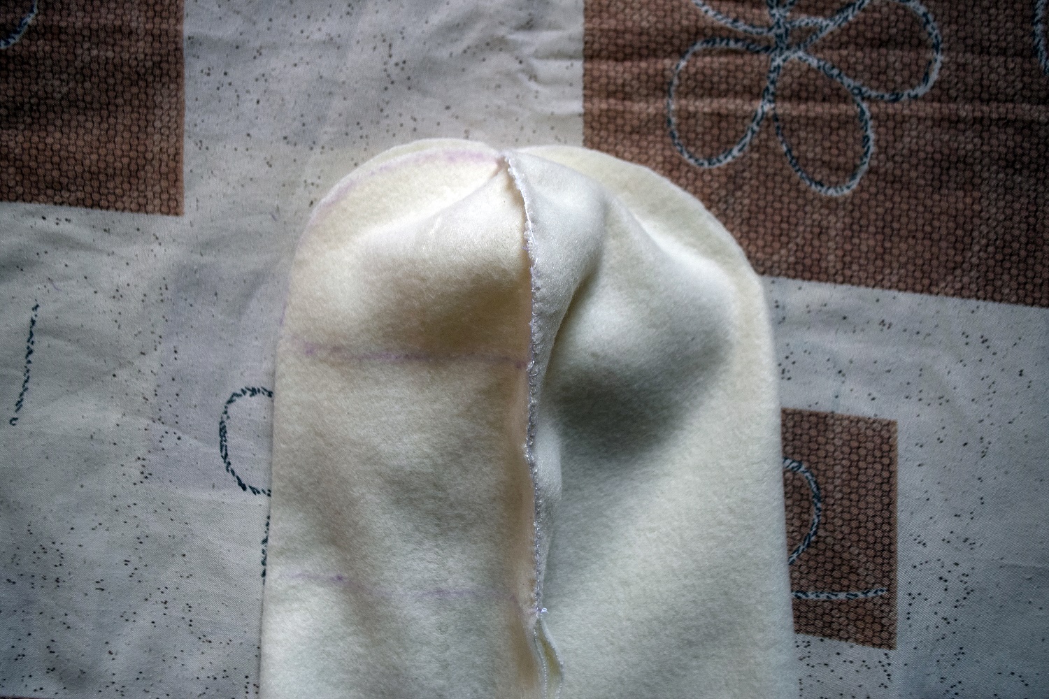В результаті ми маємо ось такий прямокутник із клинцями зверху.Скл/yak-vikroiti-i-vshiti-pidkladku-iz-flisu-u-vyazanu-shapochku-z-vushkami/адаємо фліс навпіл і зшиваємо. Стібки мають бути з того боку, з якого ви креслите викройку. Шов йде ззаду і через верх.