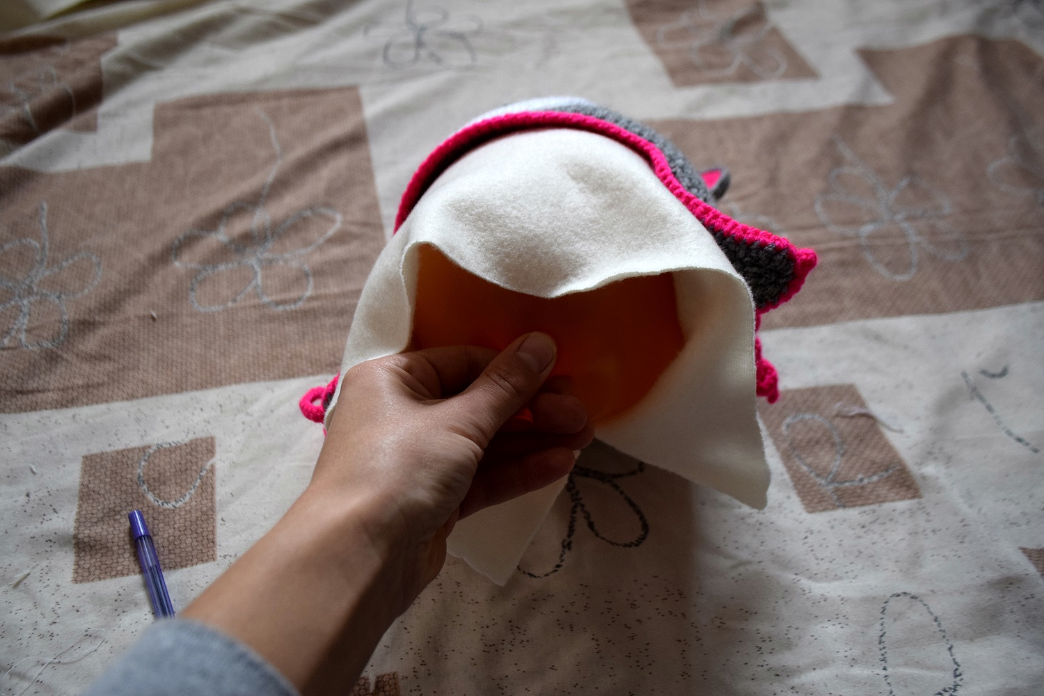 Роз/yak-vikroiti-i-vshiti-pidkladku-iz-flisu-u-vyazanu-shapochku-z-vushkami/правляємо підкладочку всередині шапочки. Для цього я одягла їх на кульку, також для цього використовують манекен. Якщо дитинка поруч, ви можете приміряти одразу на неї.